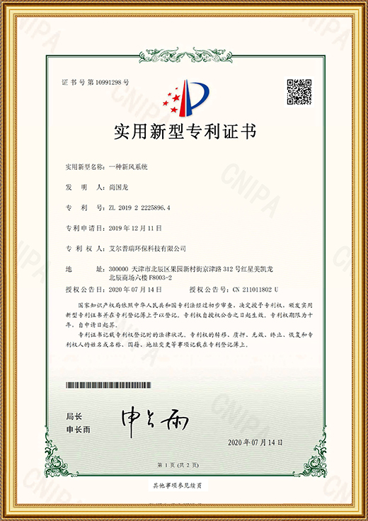 實用新型專利證書(一種新風系統(tǒng))